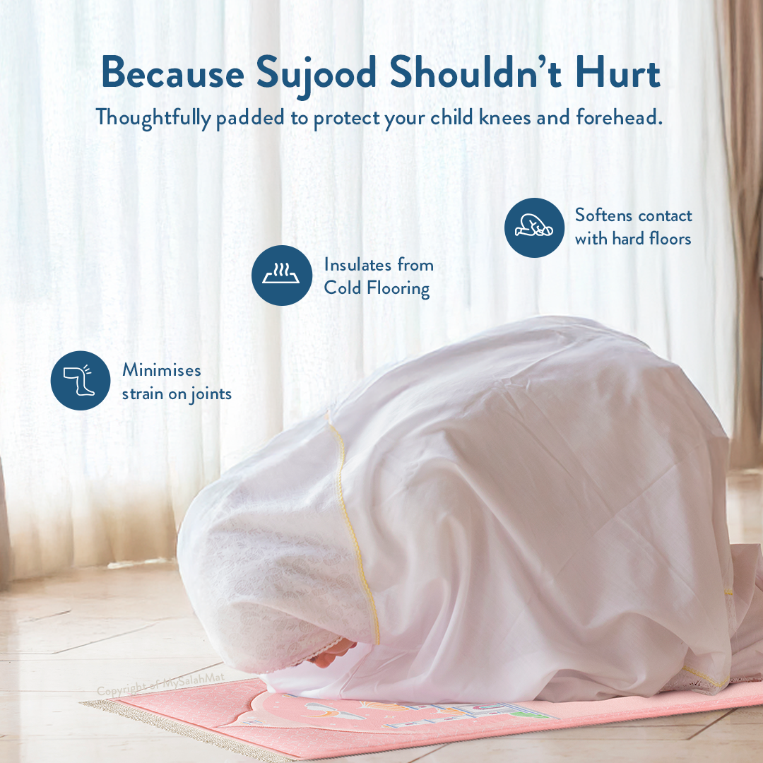 Tapis de prière rembourré pour enfants avec motif rose poudré | Urban Rugs UK | Un magnifique cadeau de Ramadan et d’Aïd pour vos proches