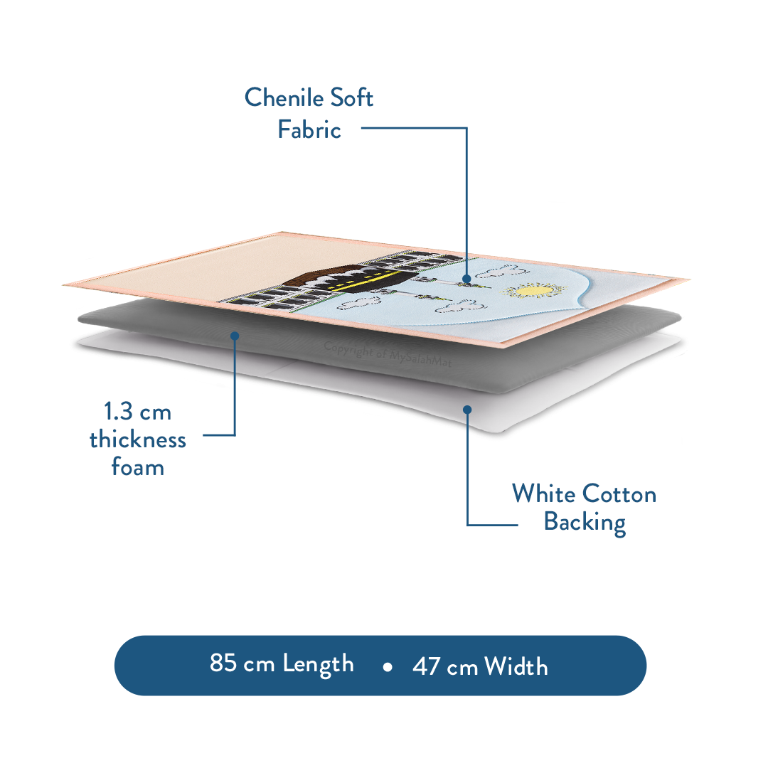 Urban Rugs UK apporte une touche d’inspiration à la salah des enfants avec le Tapis de prière rembourré pour tout-petits motif Midi à La Mecque. Avec une illustration lumineuse de la Kaaba sous le soleil de midi, entourée de nuages et de minarets, ce motif joyeux relie les enfants au cœur du culte islamique à La Mecque. Ses couleurs vives et sa bordure amusante à pompons en font un choix favori pour les bébés musulmans.