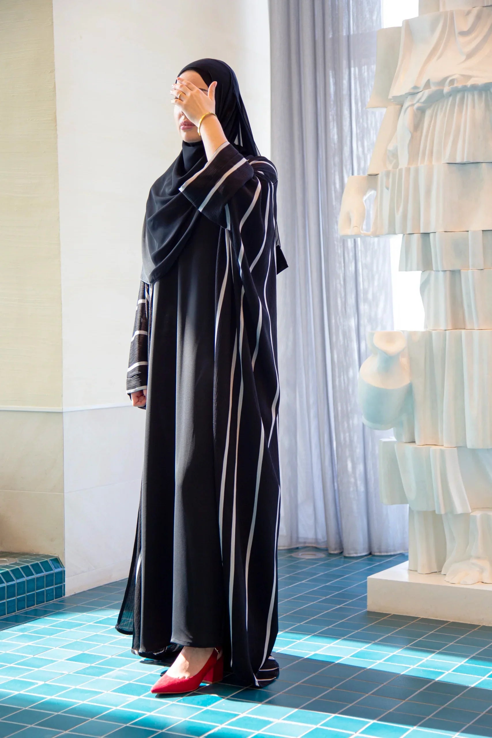 Cette abaya est une véritable pièce maîtresse. Elle est composée d'une veste style Farasha en tissu Zoom rayé de qualité supérieure, associée à une doublure Nidha noire à manches courtes pour un look chic et sophistiqué. Idéale pour les fêtes, cette abaya respire la grâce et l'élégance, ce qui en fait un atout majeur pour toute garde-robe.